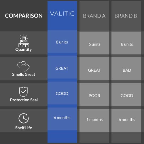 Details: Valitic Aromatherapy Shower Steamers for Stress Relief and Relaxation includes 8 Natural Essential Fizzies in Natural Lavender, Eucalyptus, Citrus, and Peppermint Essential Oil to help you breathe easier and feel more calm. Perfect for regular showers!